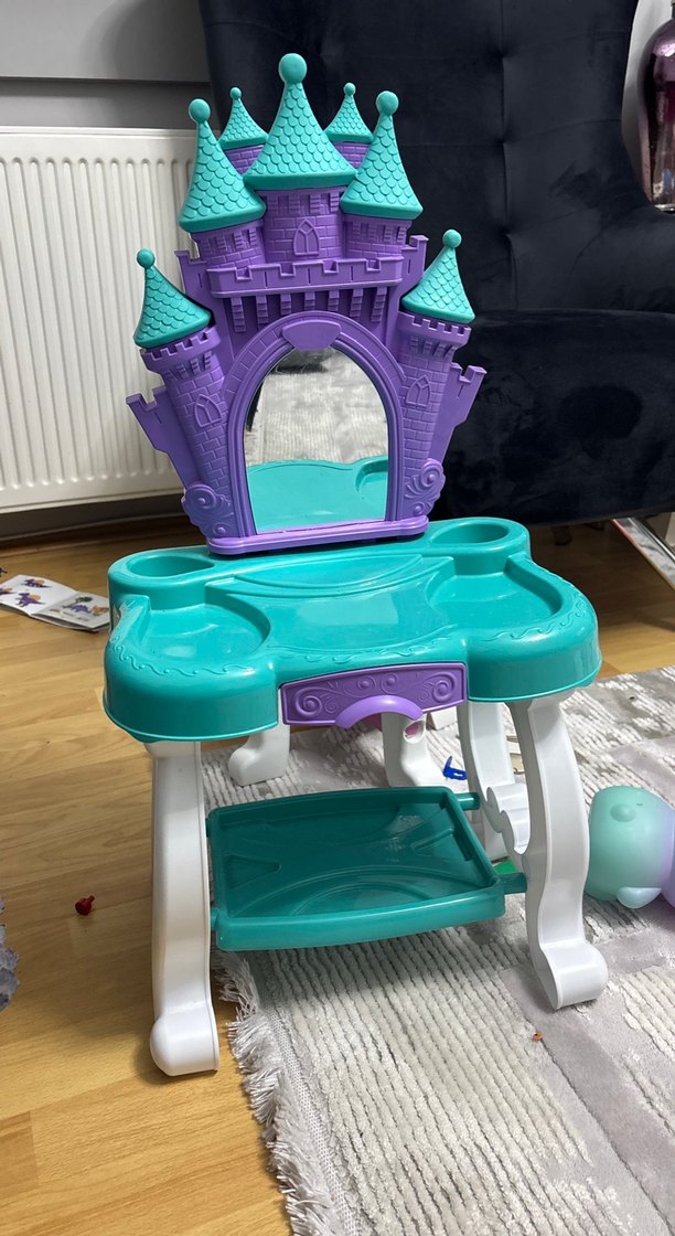 Oyuncak makyaj masası Pastel mor kale şeklinde ayna ve turkuaz bölmeli üst yüzeye sahip, beyaz ayaklı ve alt raflı çocuk şifonyeri.