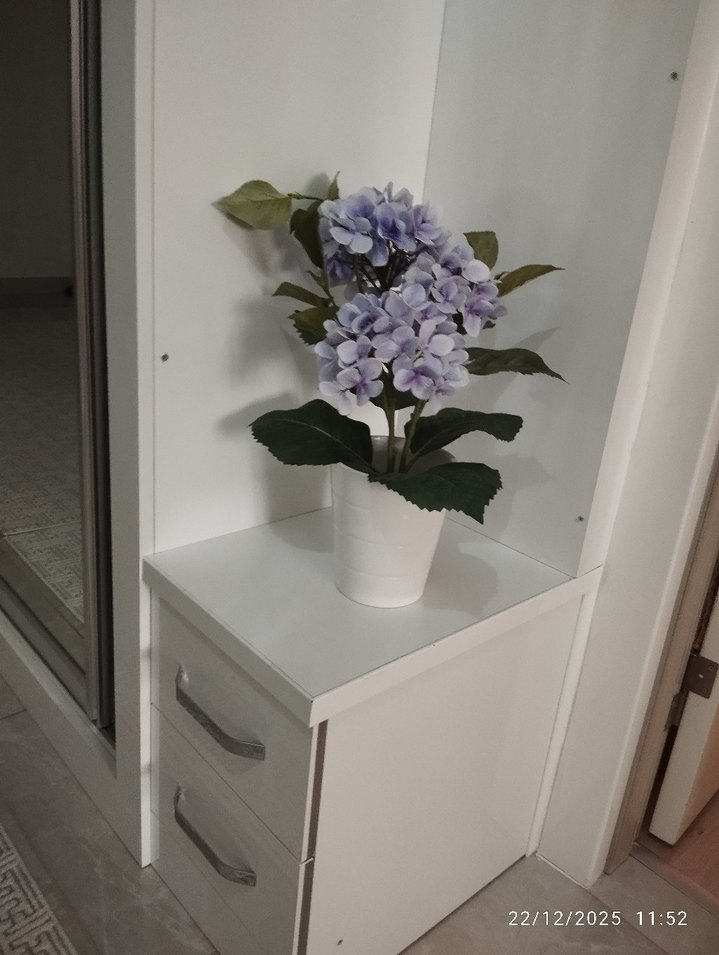 Pastel mor yapay çiçekler ve yeşil yapraklarla süslenmiş dekoratif saksı, ev dekorasyonu için uygun.beyaz saksı dahil degil