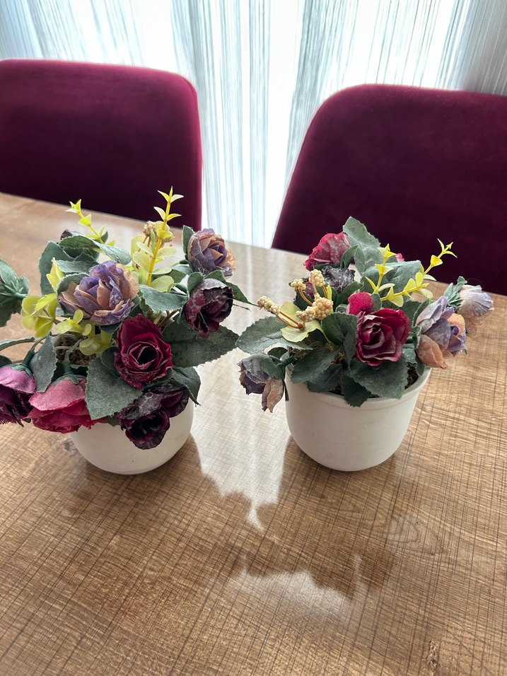 Beyaz saksılarda pastel mor yapay çiçekler ve yeşil yapraklar bulunan dekoratif set.