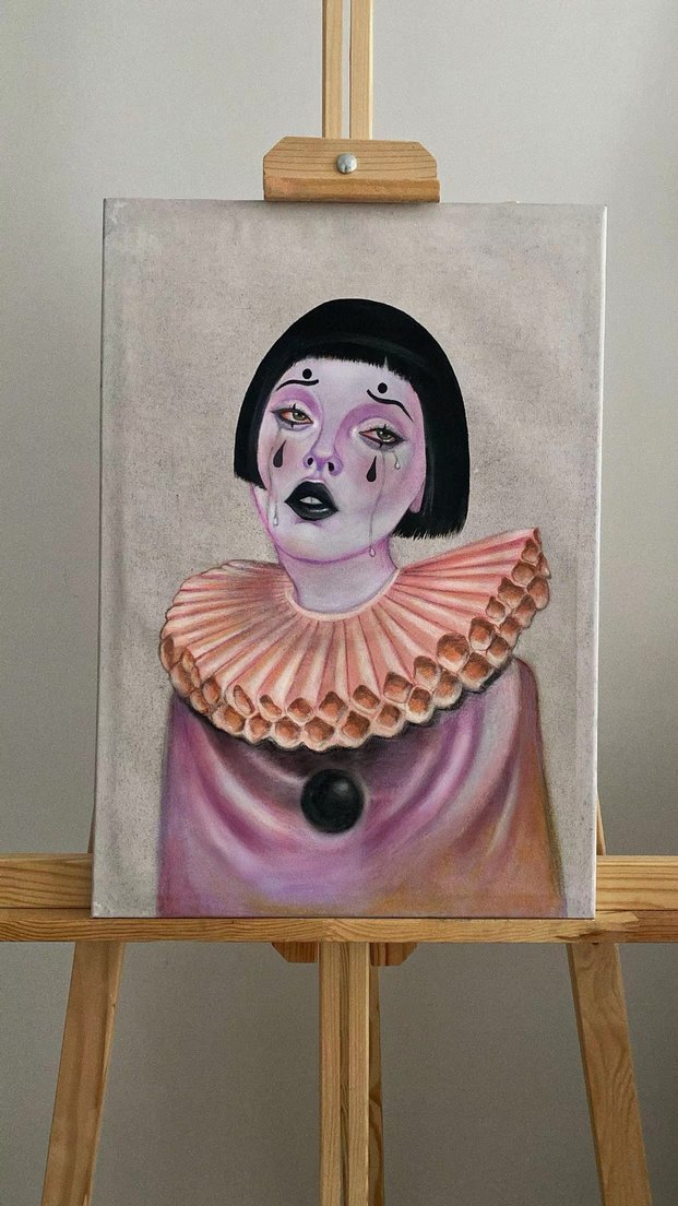 Siyah kısa saçlı palyaçonun,ağlayan ifadesiyle akrilik boyayla yapılmış 35*50 boyutlarında tablosu.
