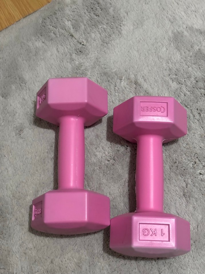Pastel pembede, her biri 1 kg olan iki dambıl seti. Hafif egzersiz ve tonlama için uygundur, desensiz ve rahat tutuş sağlar.️♀️