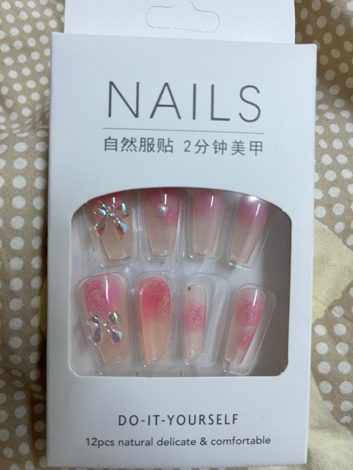 Pastel pembe tonlarında, zarif desenli ve küçük süslemeli 12 adet doğal görünümlü, rahat ve kolay uygulanabilir tırnak seti. tırnak bantı ile birlikte