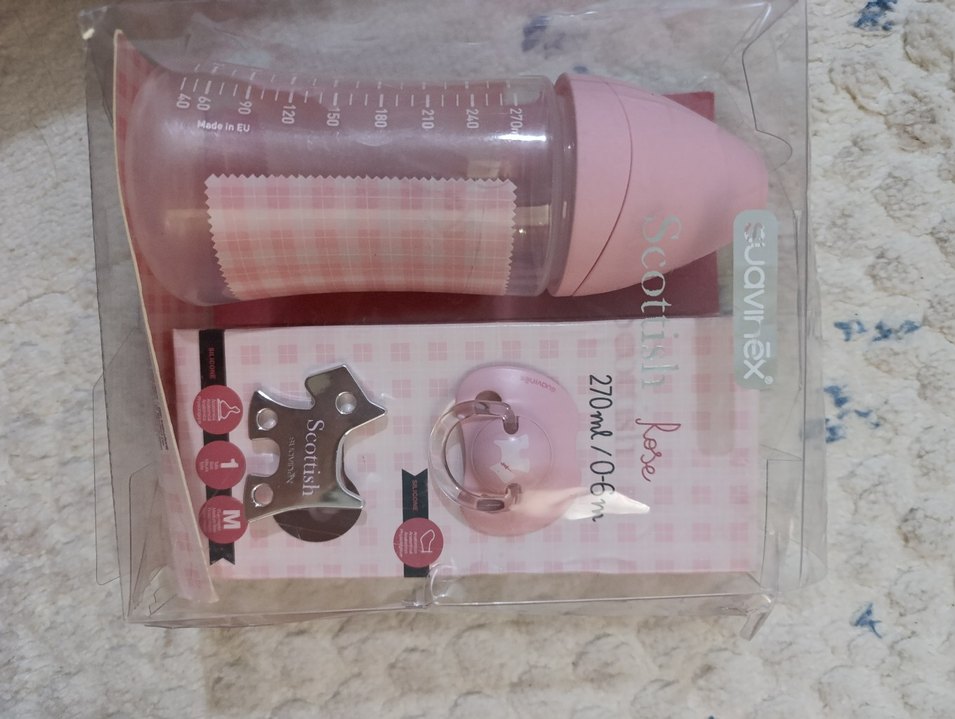 Pastel pembe renkte, 270ml kapasitesinde 0-6 ay arası bebekler için uygun biberon. Emzik ve klips ile birlikte gelir.yurtdisi malı
