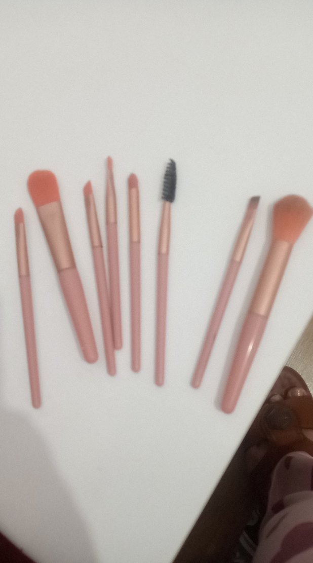 Sekiz parça pastel pembe makyaj fırçası seti, farklı uygulamalar için çeşitli fırça şekillerine sahiptir. Yumuşak kıllarıyla rahat kullanım sunar. hepsi yeni sayılır 2 tanesi kullandım çok az temizleyip göndereceğim küçük çantaya sığar