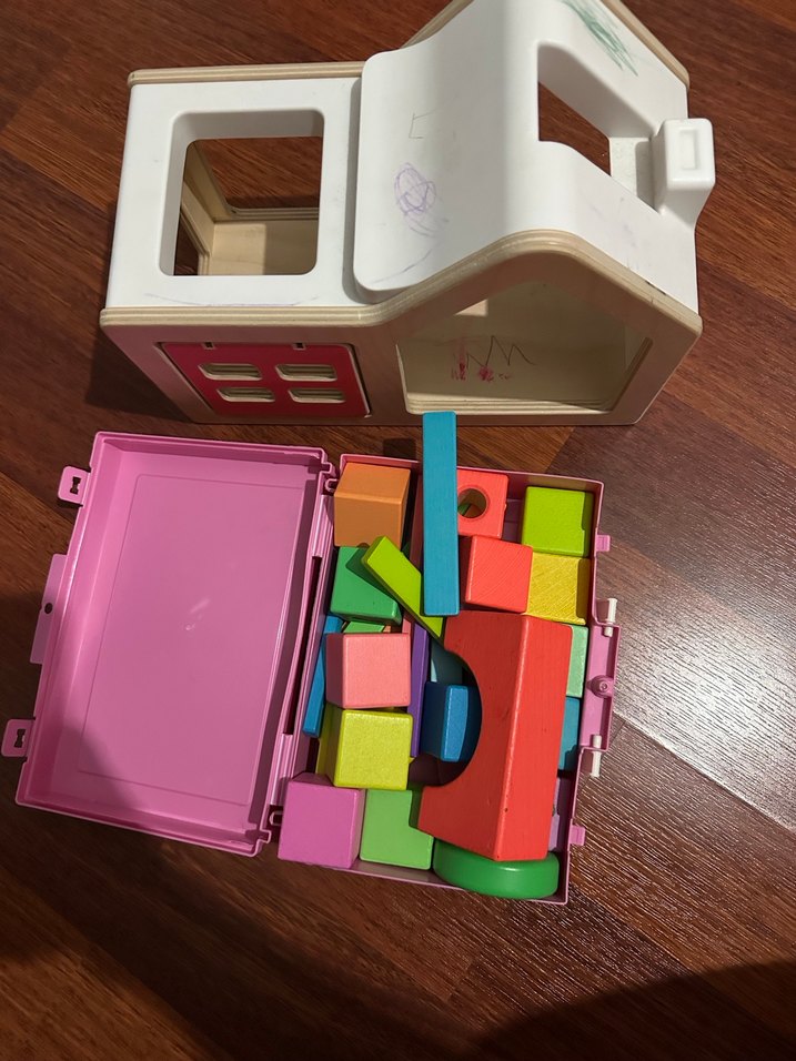 Pastel pembe renkli ev oyuncağı ve çeşitli şekillerde renkli ahşap bloklar içerir. Bloklar, pembe taşıma kutusuna sığar. Ahşap kaliteli
