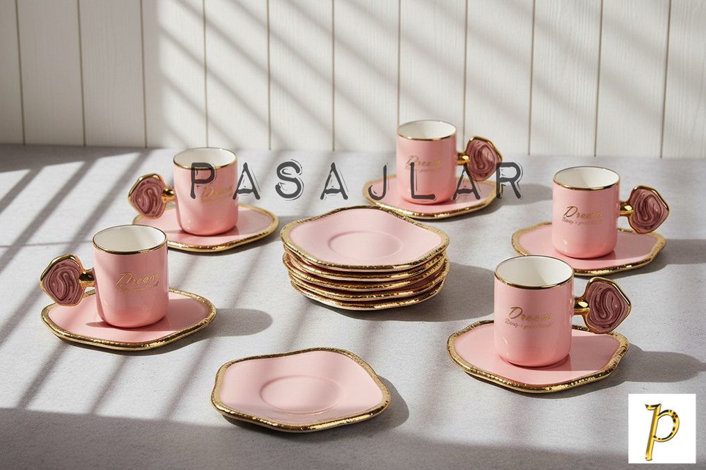 Pastel pembe renginde, altın detaylı kenarlara sahip kahve fincanı seti. Rose şeklinde kulplar ve uyumlu tabaklar içerir. ☕
