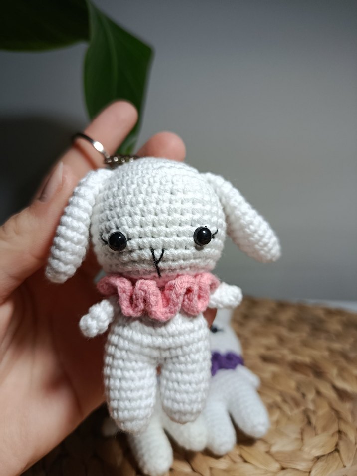Yumuşak örgü dokusuna sahip amigurumi peluş oyuncak, pastel pembe fırfırlı yakalıkla anahtarlık olarak kullanılabilir.