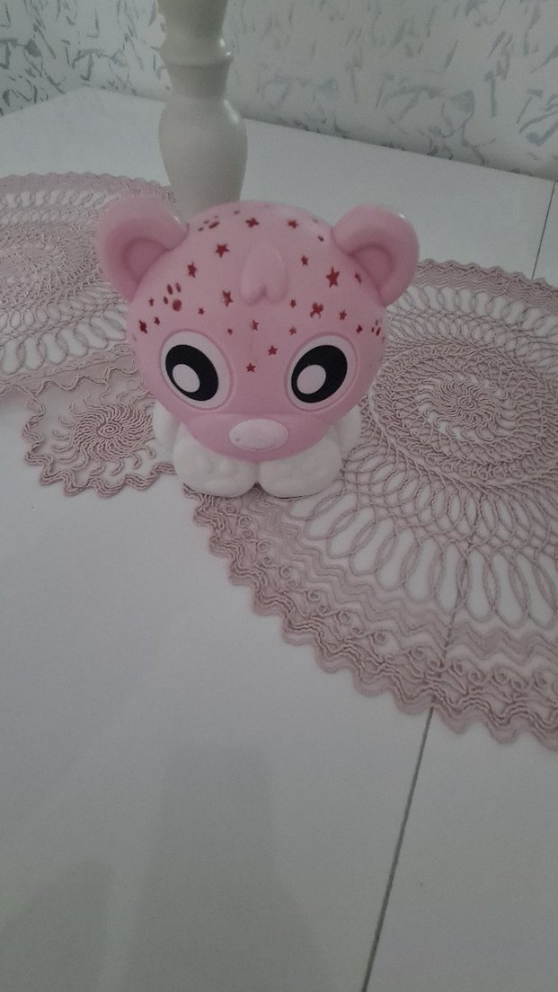 Pastel pembe renkte, büyük gözlü ve fiyonk detaylı sevimli ayı figürü. Başında yıldız desenleri bulunan pürüzsüz yüzeye sahiptir.