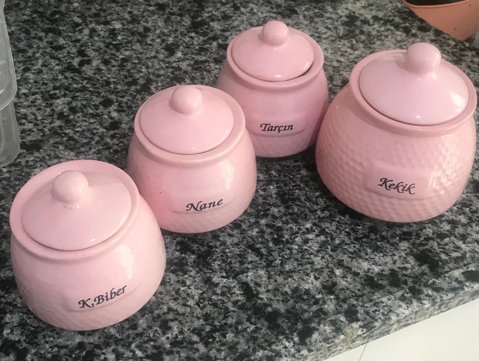 Pastel pembe renkli, kapaklı 4 adet seramik baharat kavanozu. Kekik diğer üçünden daha büyük. Çatlağı kırığı yok