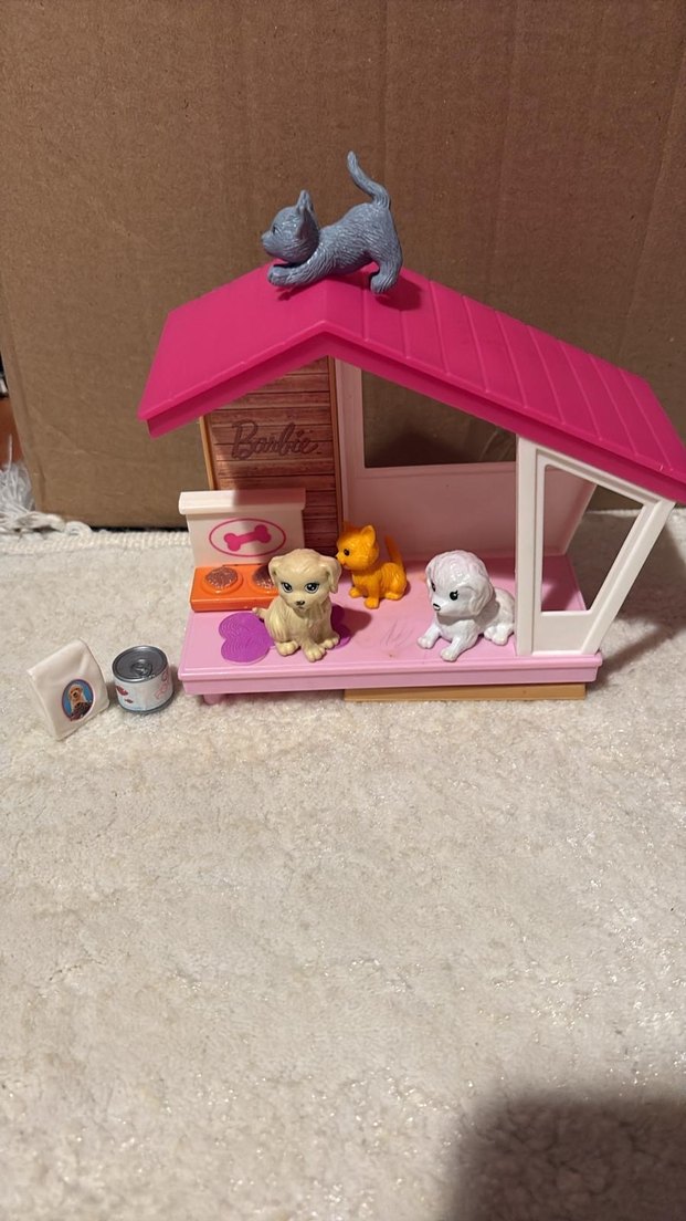 Pastel pembe Barbie evcil hayvan evi oyuncağı, küçük bir barınak ve dört minik hayvan figürü içerir. Ayrıca mama kabı ve mama poşeti gibi basit aksesuarlar bulunur.