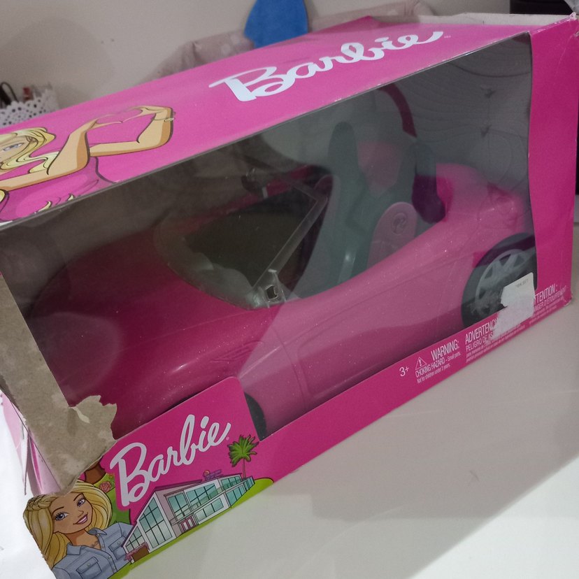 Pastel pembe renkte Barbie oyuncak araba, orijinal kutusunda ve Barbie logosuyla birlikte sunuluyor. 3 yaş ve üzeri çocuklar için uygundur.