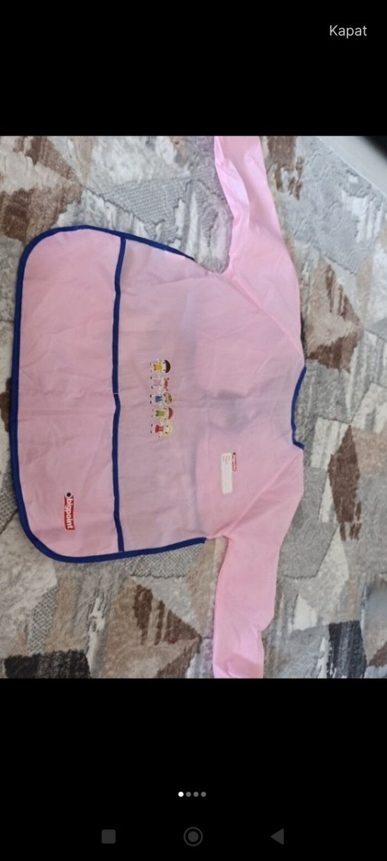 Uzun kollu, pastel pembe renkte, baskılı ve mavi kenarlıklı bebek önlüğü. Beslenme sırasında kıyafetleri korur.