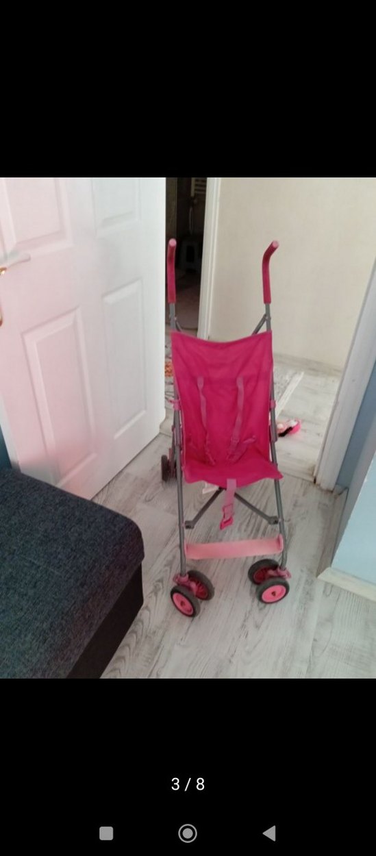 Pastel pembe renkte, hafif yapılı ve konforlu tutacaklı bebek arabası. Dört küçük tekerleğiyle kolay hareket sağlar. taşıması kolay ve pratik kızım büyüdüğü için ihtiyacım kalmadı herhangi bir sorunu yok