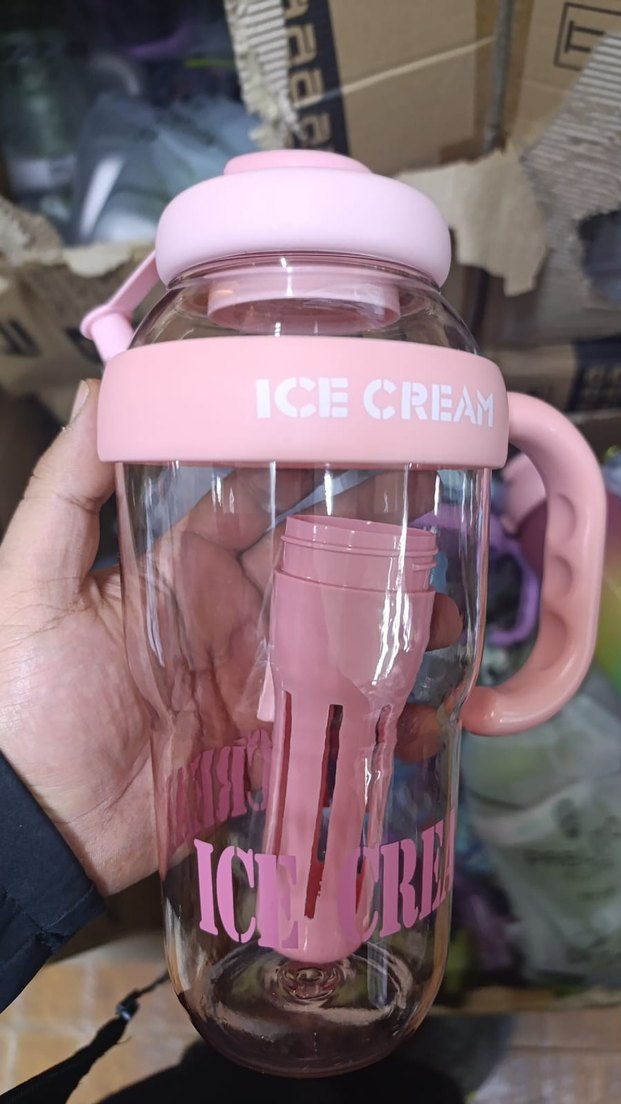 Pastel pembe renkte, tutma saplı ve içecek karıştırıcı aparatlı bebek biberonu. Üzerinde "ICECREAM" yazısı bulunur.