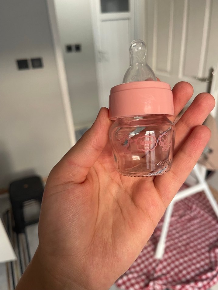 Pastel pembe kapaklı ve yumuşak emzikli, kolay kullanımlı bebek biberonu.