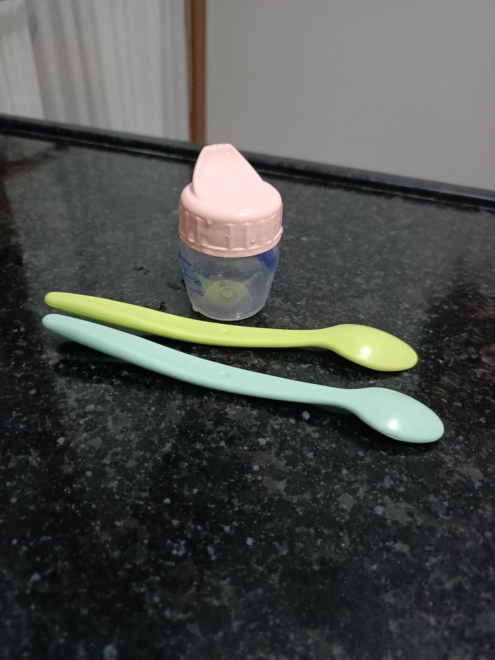 Pastel pembe renkte bebek biberonu ve yeşil ile mavi pastel renklerde iki adet besleme kaşığı içerir.