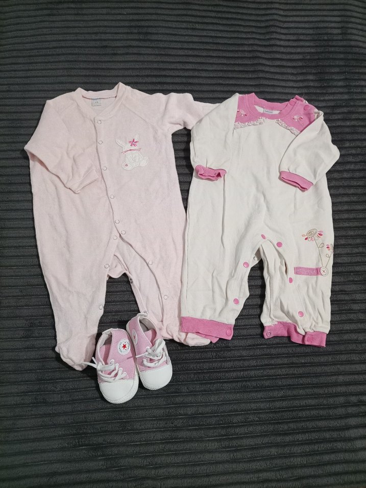 3-6 ay kız. bebek. 18 numara ayakkabılar İki adet pastel pembe, desensiz bebek hastane tulumu ve uyumlu ayakkabılardan oluşan rahat ve şık set.