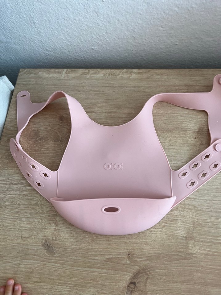 Pastel pembe, yumuşak ve esnek malzemeden yapılmış, ayarlanabilir kayışlı ve döküntüleri yakalayan ön cepli bebek mama önlüğü. Kolay temizlenir ve rahattır.