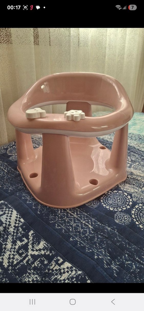 Pastel pembe renkte, bebekler için tasarlanmış, güvenli oturma için özelliklere sahip pürüzsüz plastik mama sandalyesi. ️