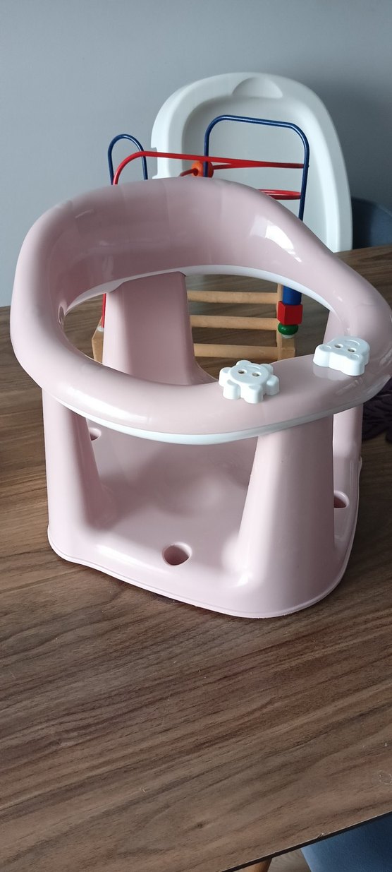 Pastel pembe renkte, pürüzsüz plastikten yapılmış, kolay temizlenebilir yüzeyli bebek mama sandalyesi. Güvenli oturma alanı sunar.