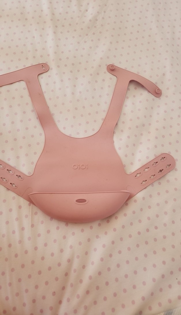 Pastel pembe renkte, yumuşak ve esnek malzemeden yapılmış bebek önlüğü. Ayarlanabilir kayışlar ve döküntüleri toplamak için cep bulunur.