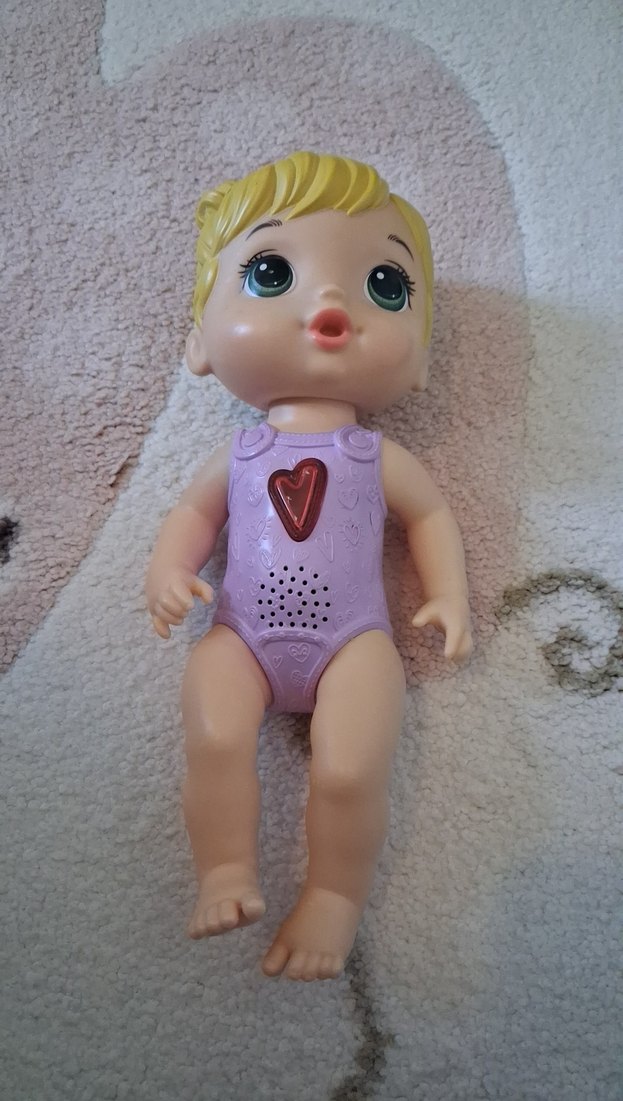 Pastel pembe renkte, büyük gözlü ve kıyafetinde kalp şeklinde düğmesi olan oyuncak bebek.