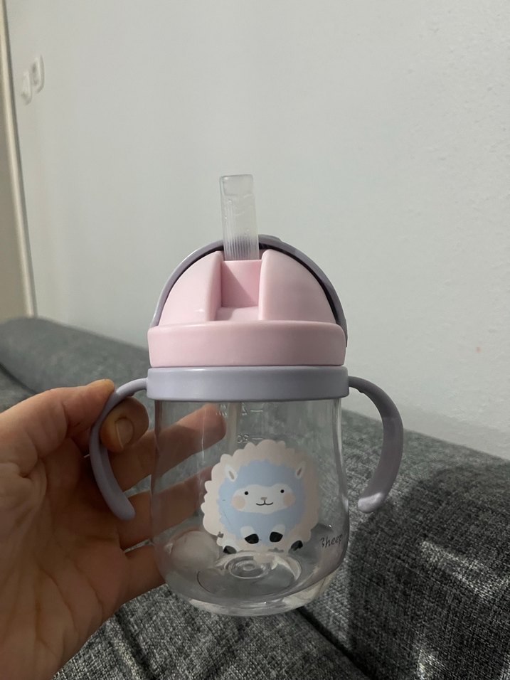 Pastel pembe renkte, çift kulplu ve pipetli bebek suluk. Şeffaf gövdesinde sevimli koyun figürü bulunur.