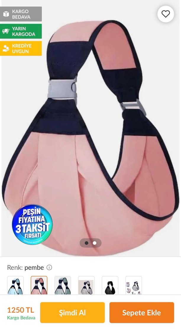 Ayarlanabilir bantlı, yumuşak kumaşlı pastel pembe bebek taşıyıcı. Rahat taşıma sağlar, yenidoğanlar için uygundur. Sıfır ürün hiç kullanılmadı