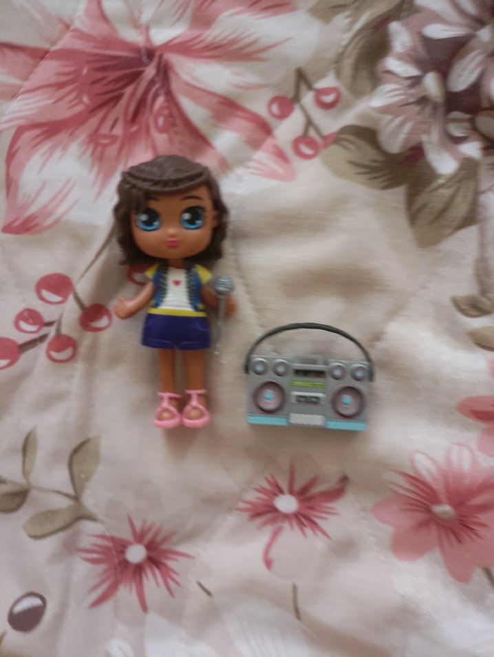 Pastel pembe renkte, kahverengi saçlı bebek ve yanında küçük pastel mavi müzik seti aksesuarı.