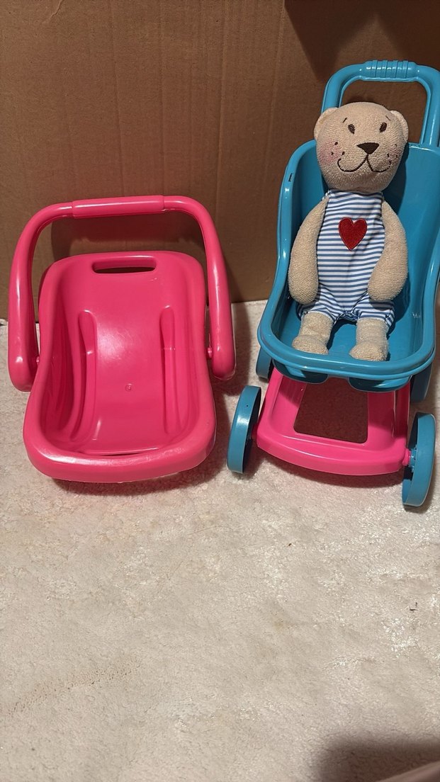 Pastel pembe oturak ve mavi çerçeveli bebek yürüteci, konfor ve hareketlilik sağlar. Yumuşak oyuncak ayı ile birlikte gelir. tek tek de alabilirsiniz