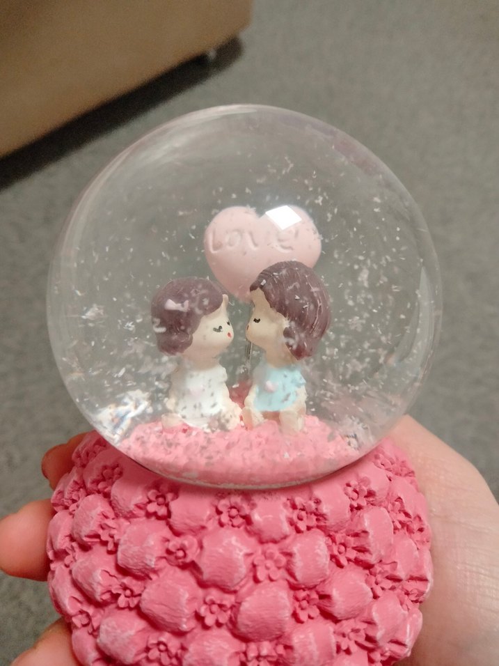 Pastel pembe renkte, üzerinde 'love' yazan kalp tutan çift figürlü kar küresi. Tabanı çiçek desenleriyle kaplıdır. ❄️ çalışmıyor pil takıp halledebilirsiniz
