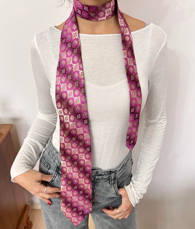 Pastel pembe renkte, retro çiçek desenli bohem kravatı. Sokak stiline özgün bir dokunuş katıyor. Desenli pinterest tarzı koyu pembe ve sedefli yansımalı kravat. Ben fular gibi kullanıyorum dilediğiniz gibi kombinleyebilirsiniz. Hiç kullanılmamış ve jelatinli. #kravat #bordokravat #fuşyakravat #fular