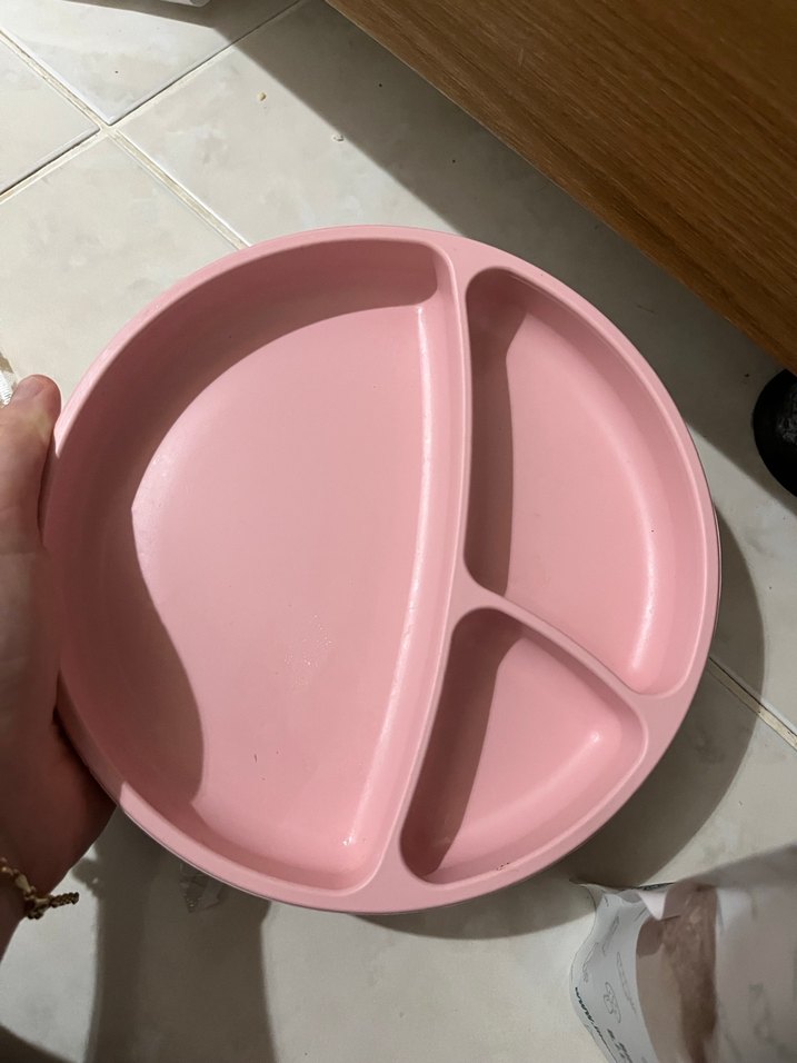Pastel pembe renkte, üç bölmeli çocuk tabak. Yiyecekleri ayırmak için uygun, çocuk dostu ve kullanımı kolay malzemeden yapılmıştır. ️ sayılı kullanıldı. Kızım çok sevmedi.