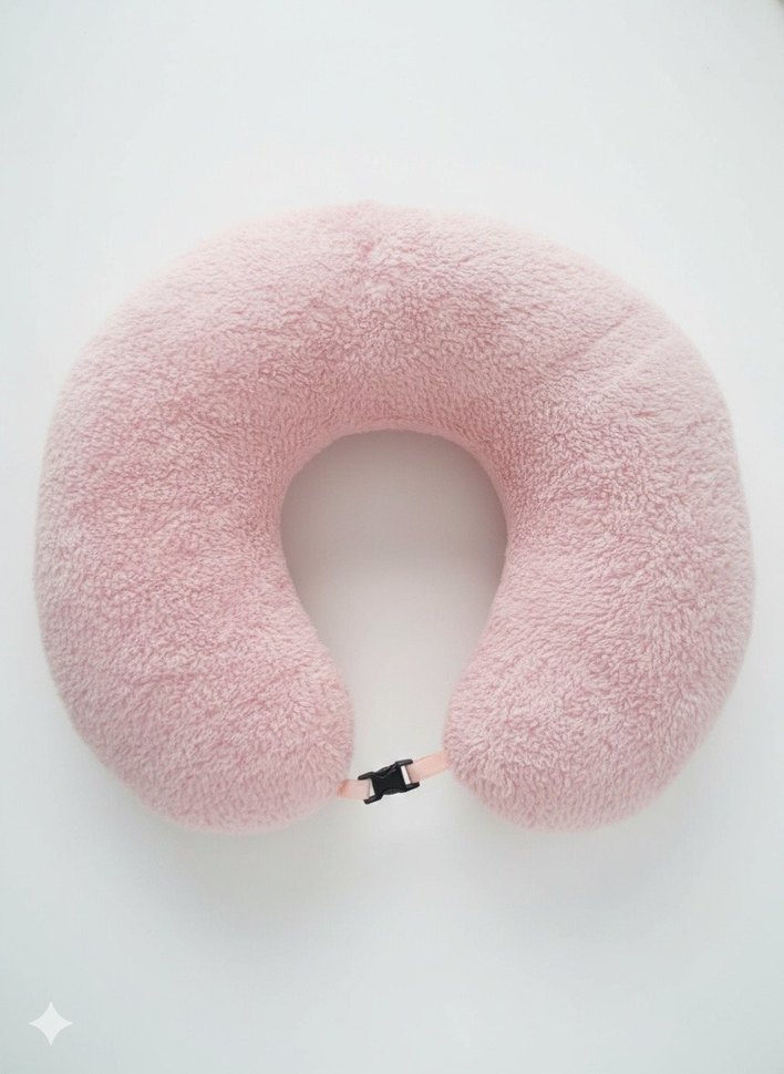 Yumuşak peluş dokulu, klipsli pastel pembe boyun destek yastığı. Seyahat veya dinlenme sırasında konfor sağlar,az kullanılmıştır.