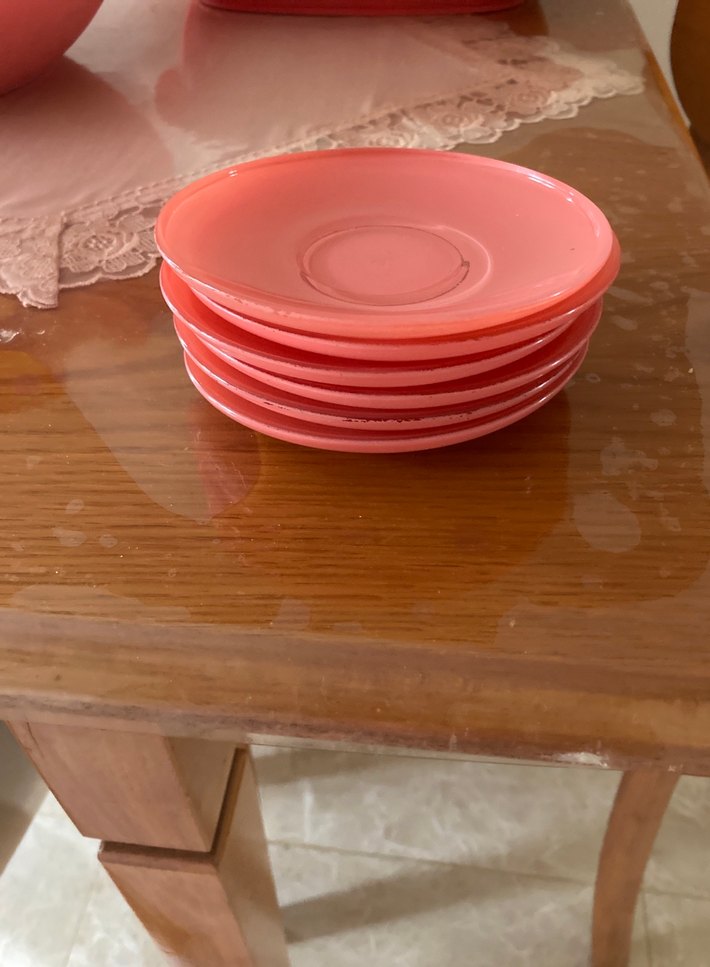 Pastel pembe renkte, cam malzemeden yapılmış, çay bardağı altlığı olarak kullanılabilen tabak seti. ️