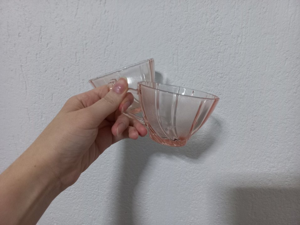 Pastel pembe renkte, kabartmalı cam fincan, şeffaf kulplu ve zarif görünümlüdür. ☕ ikisinin fiyatıdır