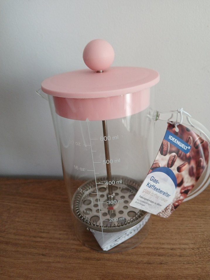 Pastel pembe renkte, cam gövdeli ve ölçü işaretli çay makinesi. Demleme için piston mekanizmalı, şık ve kullanışlıdır.