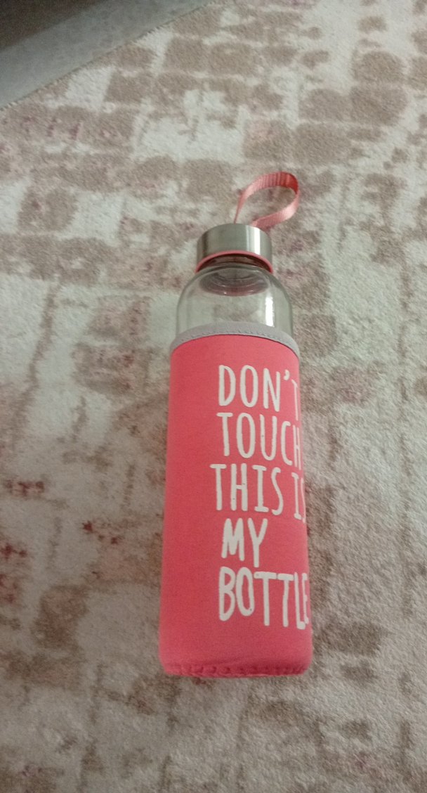 Pastel pembe renkte, üzerinde "DON'T TOUCH THIS IS MY BOTTLE" yazılı yumuşak kaplamalı cam su şişesi, metal kapak ve taşıma halkası bulunur.