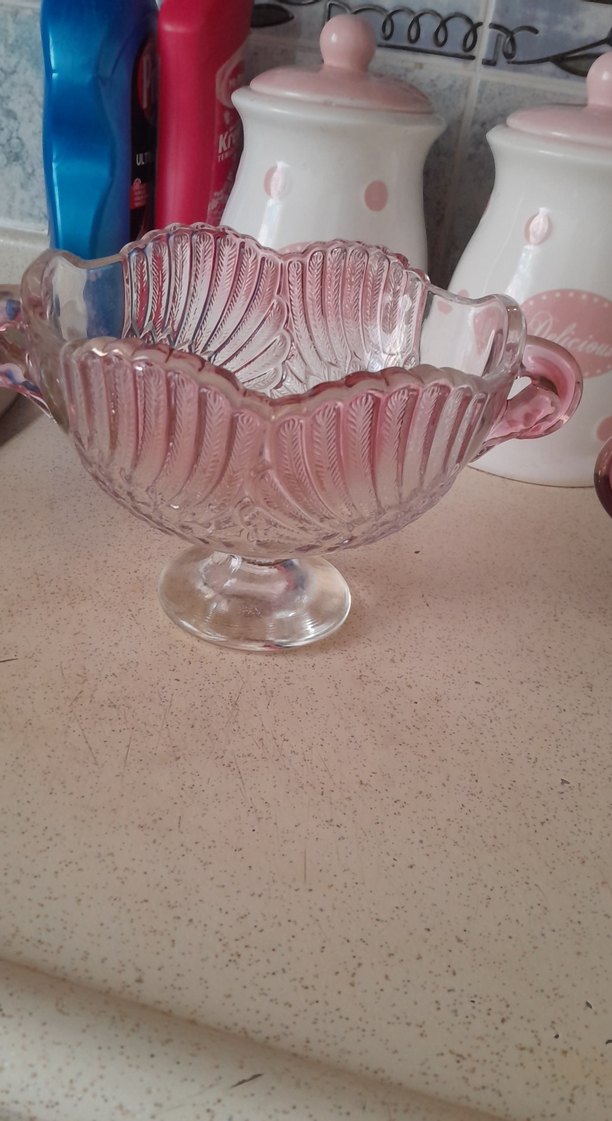 Pastel pembe camdan yapılmış, dalgalı kenarları ve dekoratif çıkıntıları olan, küçük bir kaide üzerinde duran vazo. meyve tabağı ikisi 1000 tl fiyatta yardımcı olurum