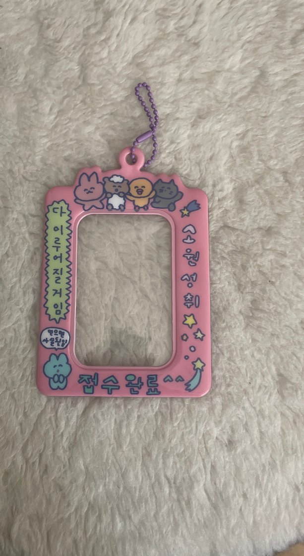 Pastel pembe renkte, sevimli çizgi karakterler ve Korece yazılar içeren, mor zincirli yumuşak malzemeden yapılmış çerçeve anahtarlık. Sıfır kullanılmamış. 1-2 güne hediye ile kargolarım