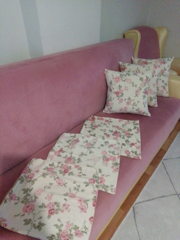 Yumuşak pastel pembe çiçek desenli, geleneksel tarzda dekoratif yastık kılıfı. Salonunuanıza sıcaklık katar. 6 adettir arka tarafı sade renkli iki taraflı da kullanılabilir bir tanesinin fermanı bozuk dikip kullanılabilir 5 tanesini baş parmaklı ama bozuk değil kullanıma engel değil