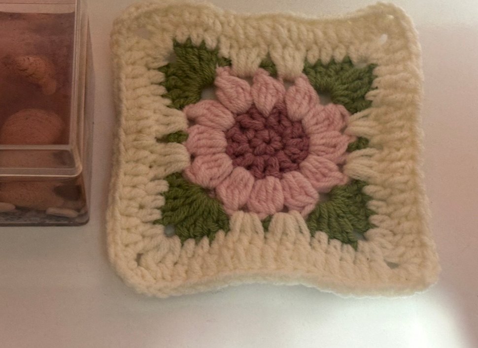 Pastel pembe çiçek desenli, yeşil yaprak detaylı yumuşak el örgüsü bardak altlığı İstediğiniz renklerde de örebiliriz. ☺️❤️