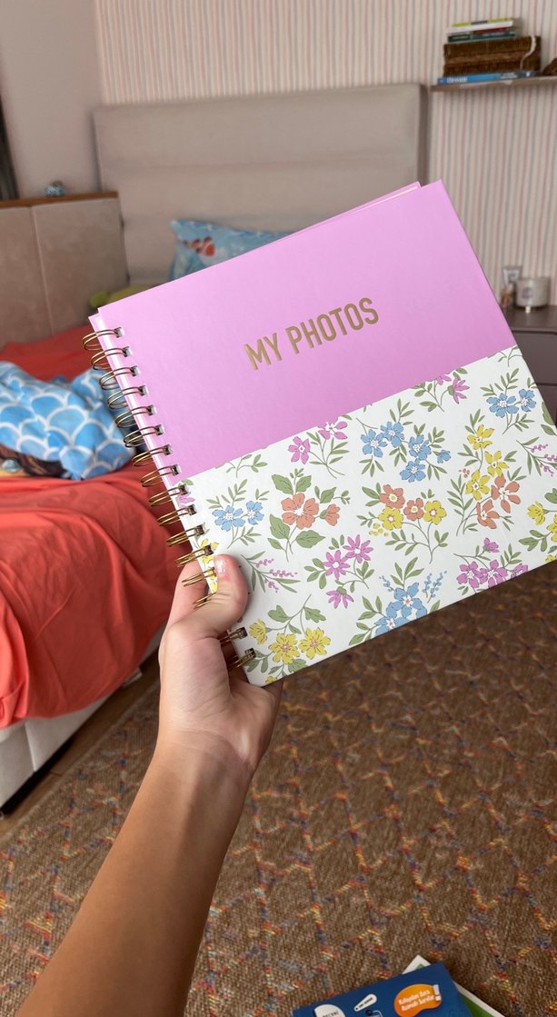 Pastel pembe renkte, çiçek desenli ve "MY PHOTOS" yazılı spiral ciltli fotoğraf albümü.