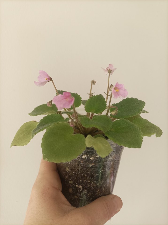 Pastel pembe çiçekleri ve yeşil yaprakları olan küçük saksı bitkisi, ev dekorasyonu için uygun.