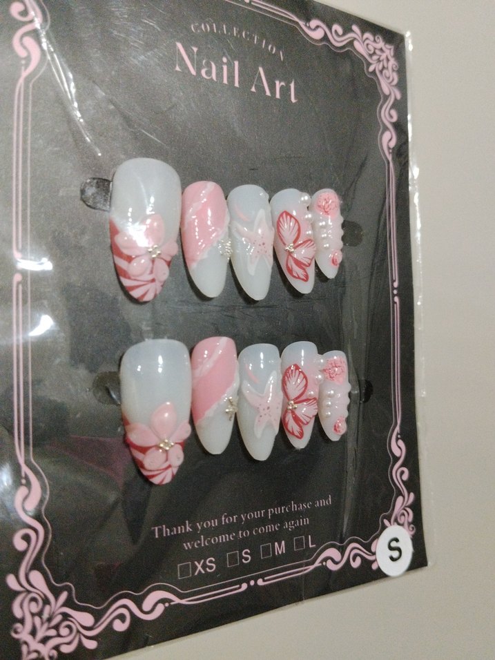 Pastel pembe tonlarında, çiçek ve kelebek desenli tırnak süsleri seti. Küçük inci detayları içerir, farklı boylarda mevcuttur.