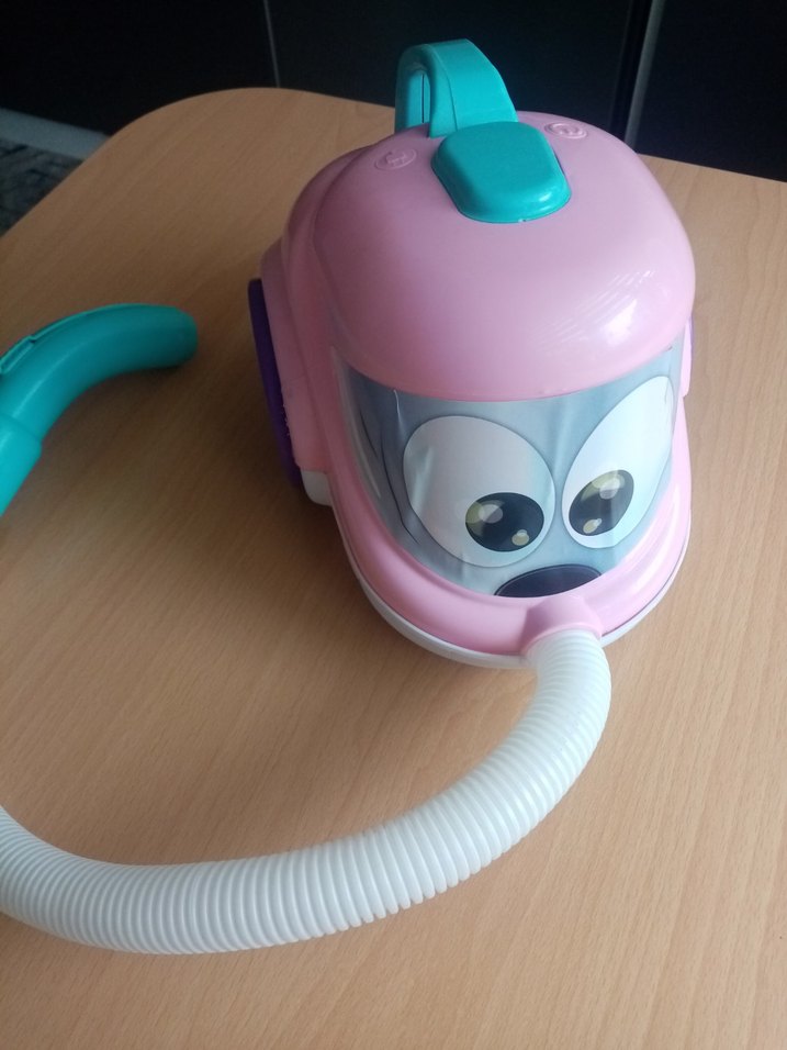 Pastel pembe renkte, büyük gözlü eğlenceli tasarıma sahip çocuk elektrikli süpürgesi. Taşımayı kolaylaştıran turkuaz sapı bulunur.