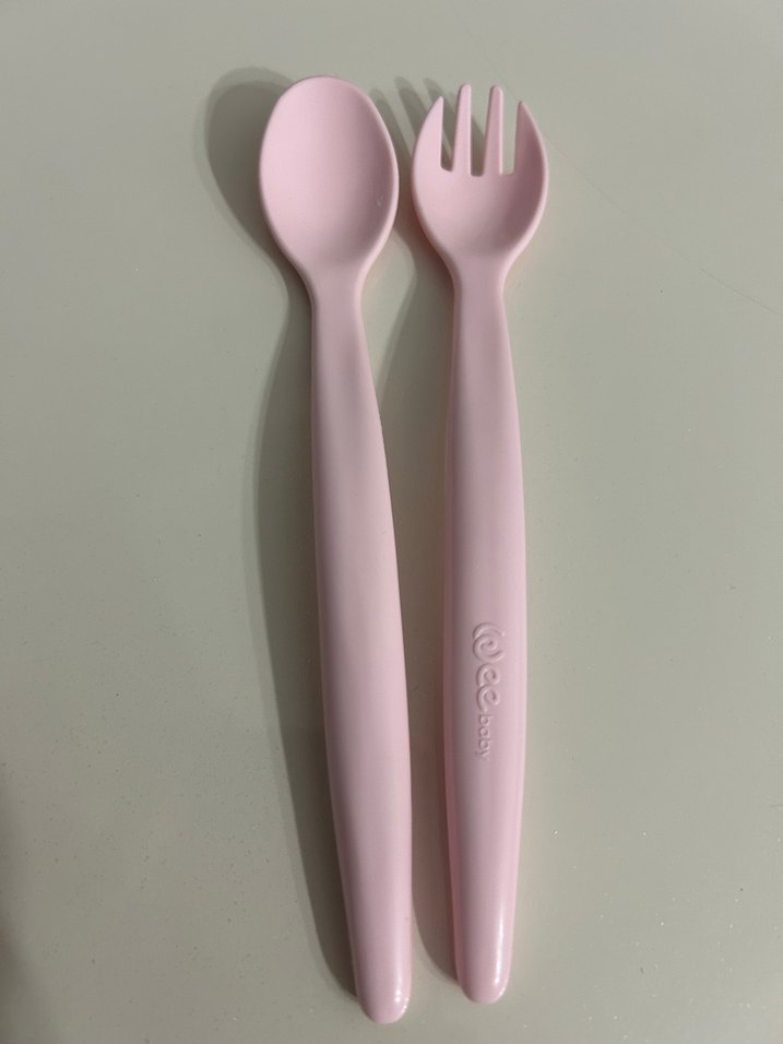 Pastel pembe renkte çocuk kaşık ve çatal seti, kolay tutulabilen yumuşak saplara sahiptir.