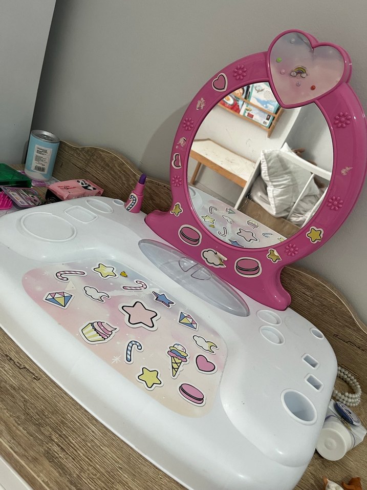 Pastel pembe renkte, kalp şeklinde aynası olan çocuk makyaj masası. Beyaz tabla renkli çıkartmalarla süslenmiş ve küçük eşyalar için çoklu bölmeleri var. Son görselde güncel fiyatı mevcut