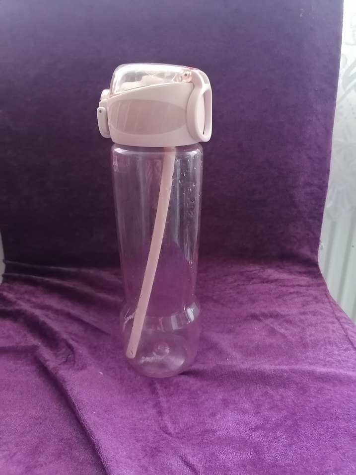 Pastel pembe çocuk matara, kolay içim için açılır kapak ve dahili pipet içerir. Şeffaf gövdesi sıvıyı görmenizi sağlar.