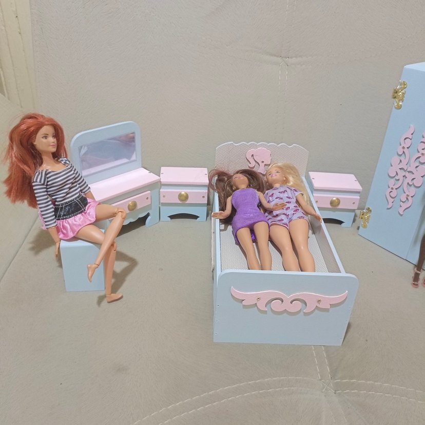 Pastel pembe çocuk oyun mobilyası seti, yatak, iki komodin ve aynalı bir makyaj masası içerir. Bebek oyunları için uygundur. ️barbie bebekler görseldir ürüne dahil değildir